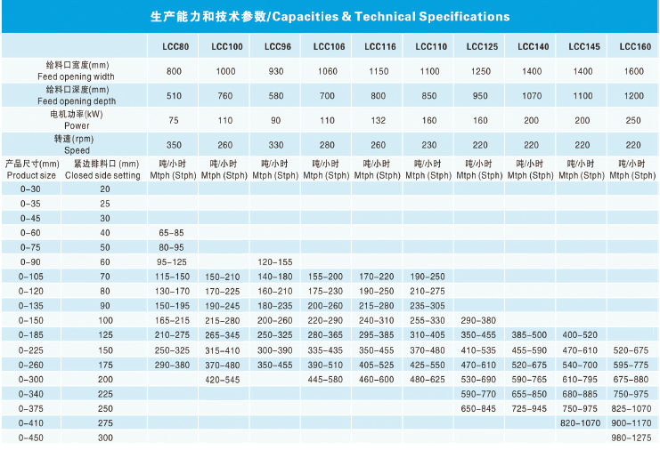 以上數(shù)據(jù)所表示的破碎機(jī)產(chǎn)量,是針對平均比重為 2.7t/m 3 ,給料能夠順利進(jìn)入破碎腔、無架橋卡堵現(xiàn)象,給料剔除小于排礦口細(xì)料時取小值,含細(xì)料時取大值。產(chǎn)量可能隨給料方式和物料性質(zhì)諸如粒度組成、含水含泥量、松散密度和可碎性而變化。